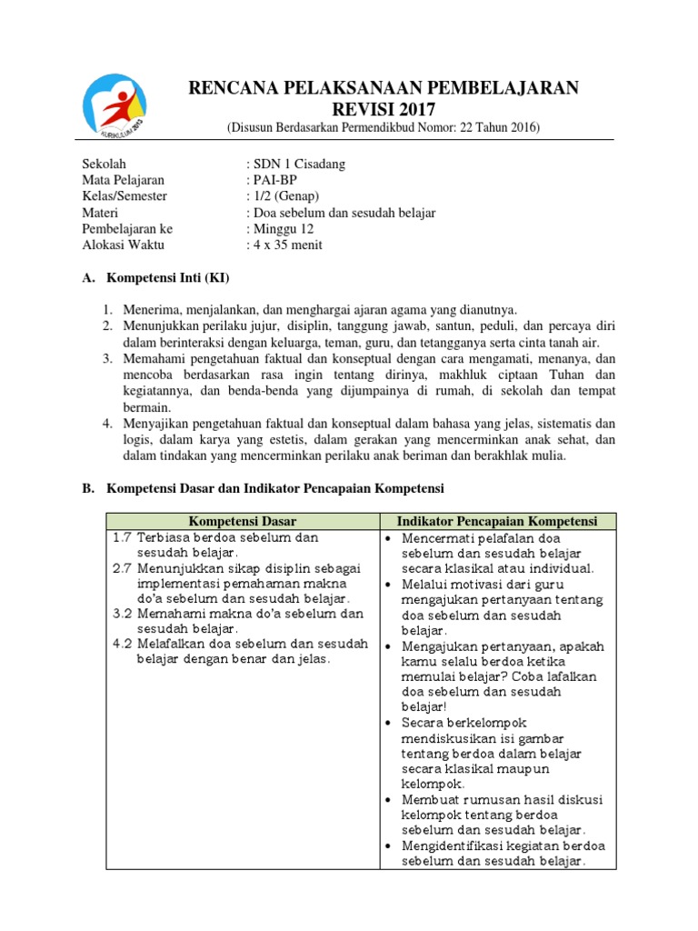19 Rpp 12 Pai Bp 2017 Kelas 1 Doa Sebelum Dan Sesudah Belajar