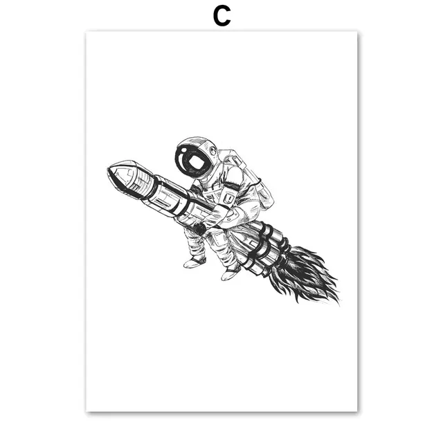 Black White Astronaut Rocket Moon Bicycle Wall Art Canvas Painting
