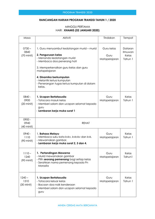 Rancangan Harian Program Transisi Tahun 1 Sesi 2020